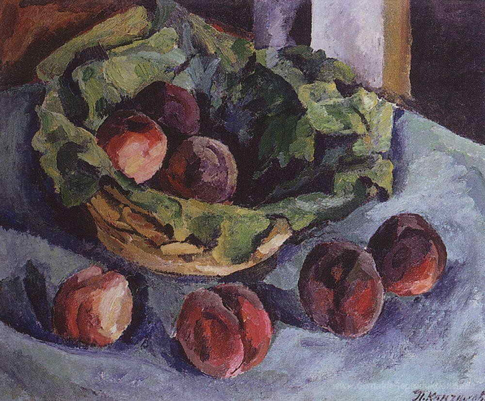 Wir bieten Ihnen eine handgefertigte Reproduktion auf Leinwand des berühmten Kunstwerks 'Stillleben. Peaches.' von Pyotr Konchalovsky, aus dem Reproduktionsmuseum.
