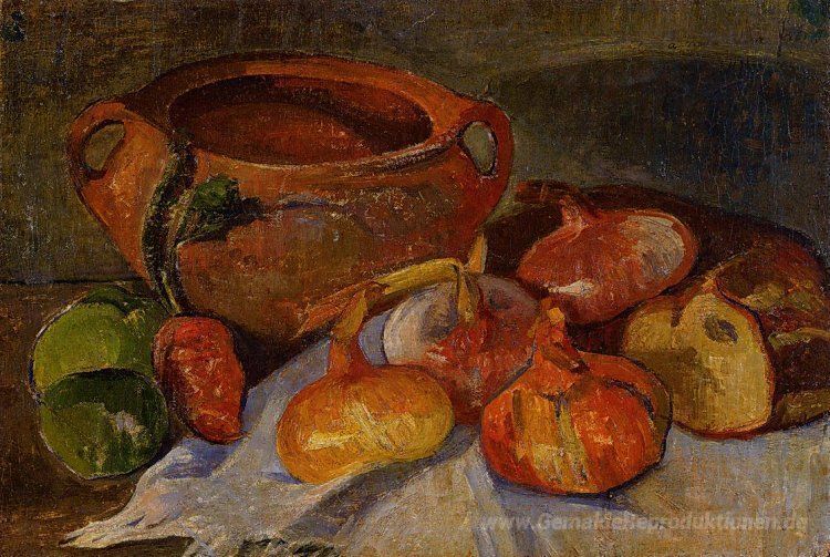 Wir bieten Ihnen eine handgefertigte Reproduktion auf Leinwand des berühmten Kunstwerks 'Stillleben: Pit, Zwiebeln, Brot und grüne Äpfel' von Meijer de Haan, aus dem Reproduktionsmuseum.