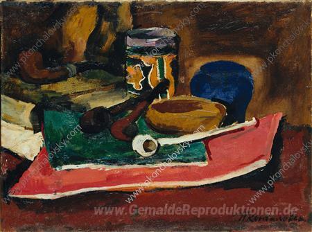 Wir bieten Ihnen eine handgefertigte Reproduktion auf Leinwand des berühmten Kunstwerks 'Stillleben. Rosa Notebook und Mobilteil.' von Pyotr Konchalovsky, aus dem Reproduktionsmuseum.