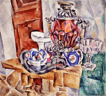 Wir bieten Ihnen eine handgefertigte Reproduktion auf Leinwand des berühmten Kunstwerks 'Stillleben. Samovar.' von Pyotr Konchalovsky, aus dem Reproduktionsmuseum.