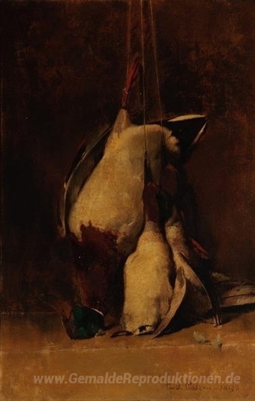 Wir bieten Ihnen eine handgefertigte Reproduktion auf Leinwand des berühmten Kunstwerks 'Stillleben - Stockente und Aquamarine' von Emil Carlsen, aus dem Reproduktionsmuseum.
