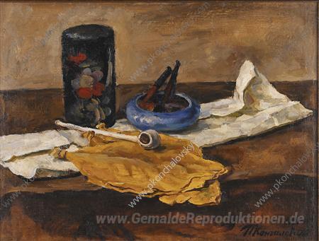 Wir bieten Ihnen eine handgefertigte Reproduktion auf Leinwand des berühmten Kunstwerks 'Stillleben. Tabakblättern.' von Pyotr Konchalovsky, aus dem Reproduktionsmuseum.