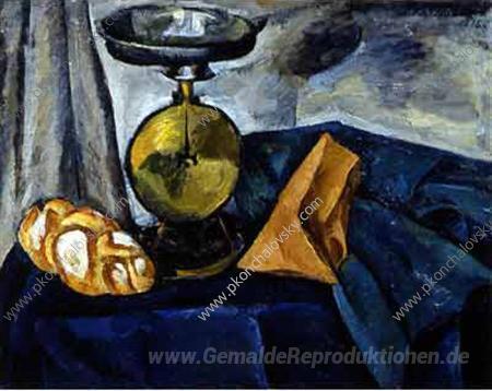 Wir bieten Ihnen eine handgefertigte Reproduktion auf Leinwand des berühmten Kunstwerks 'Stillleben. Waage.' von Pyotr Konchalovsky, aus dem Reproduktionsmuseum.