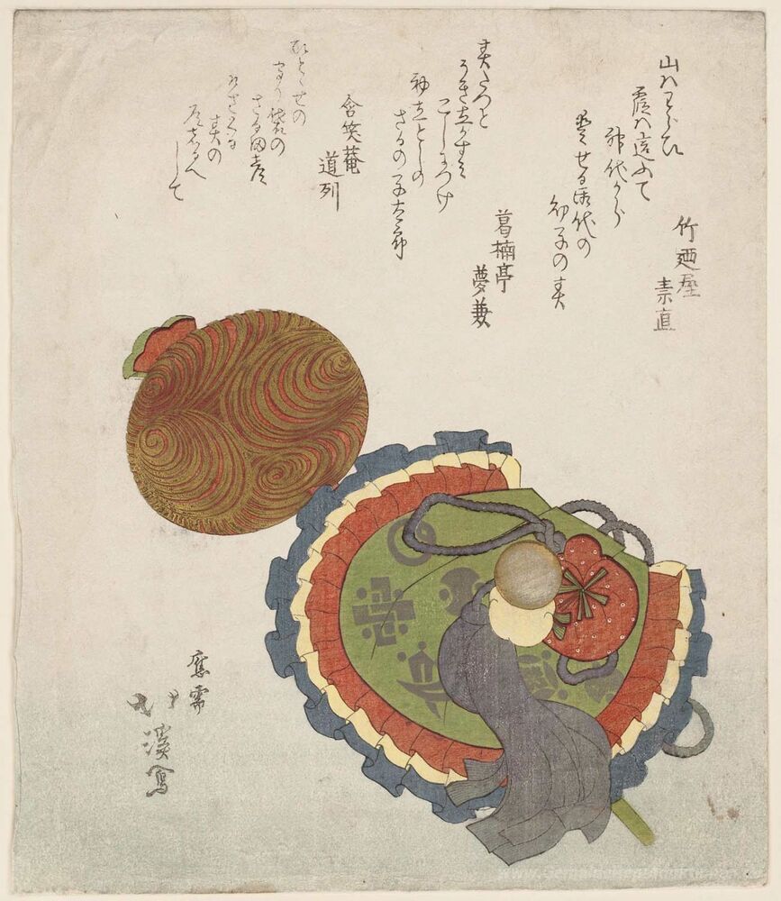 Wir bieten Ihnen eine handgefertigte Reproduktion auf Leinwand des berühmten Kunstwerks 'Symbole des viel Glück' von Toyota Hokkei, aus dem Reproduktionsmuseum.
