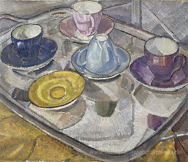 Wir bieten Ihnen eine handgefertigte Reproduktion auf Leinwand des berühmten Kunstwerks 'Teacups: The Harlequin Set' von Grace Cossington Smith, aus dem Reproduktionsmuseum.