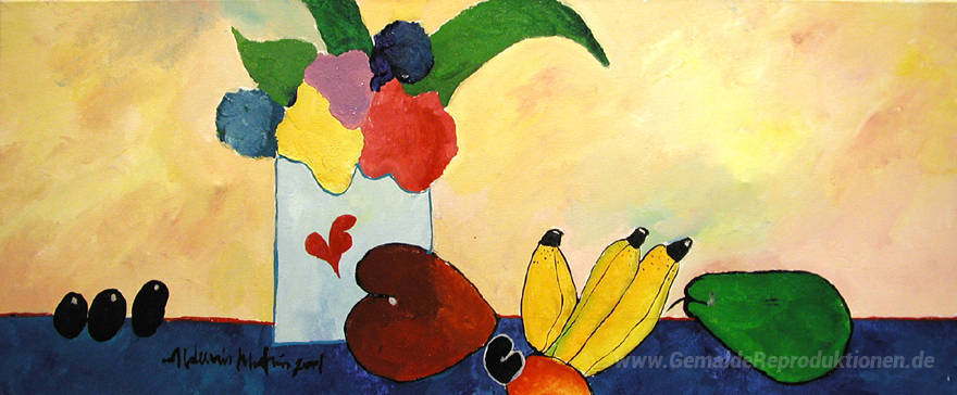 Wir bieten Ihnen eine handgefertigte Reproduktion auf Leinwand des berühmten Kunstwerks 'Vase mit Blumen und Frucht' von Aldemir Martins, aus dem Reproduktionsmuseum.