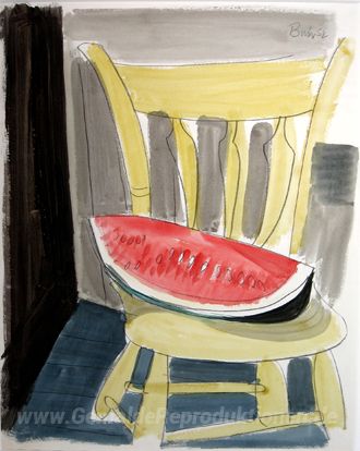 Wir bieten Ihnen eine handgefertigte Reproduktion auf Leinwand des berühmten Kunstwerks 'Wassermelone auf Stuhl' von Jack Bush, aus dem Reproduktionsmuseum.