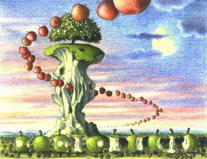 Wir bieten Ihnen eine handgefertigte Reproduktion auf Leinwand des berühmten Kunstwerks 'Apple-mania' von Jacek Yerka, aus dem Reproduktionsmuseum.
