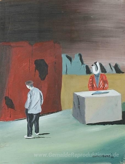 Wir bieten Ihnen eine handgefertigte Reproduktion auf Leinwand des berühmten Kunstwerks 'Ausstellung in einem unfreundlichen Landschaft' von Conroy Maddox, aus dem Reproduktionsmuseum.