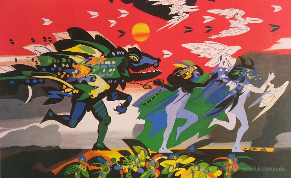 Wir bieten Ihnen eine handgefertigte Reproduktion auf Leinwand des berühmten Kunstwerks 'Baranquilla' von Alejandro Obregon, aus dem Reproduktionsmuseum.