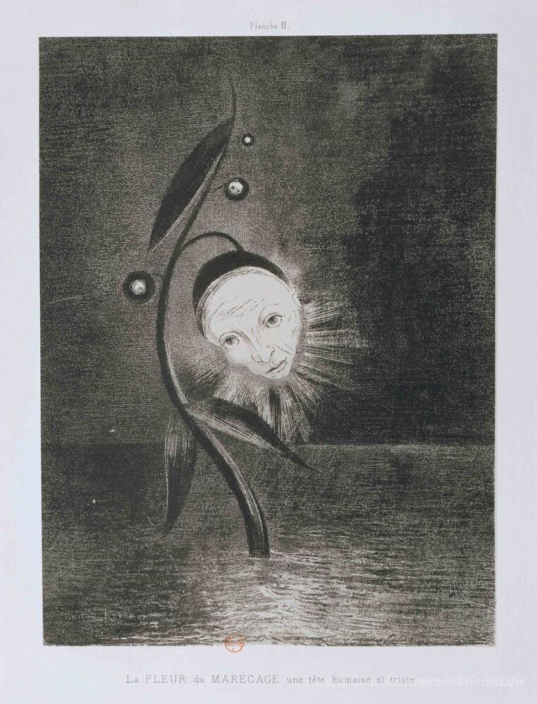 Wir bieten Ihnen eine handgefertigte Reproduktion auf Leinwand des berühmten Kunstwerks 'Blumen der Sumpf, ein Kopf Mensch und traurig' von Odilon Redon, aus dem Reproduktionsmuseum.
