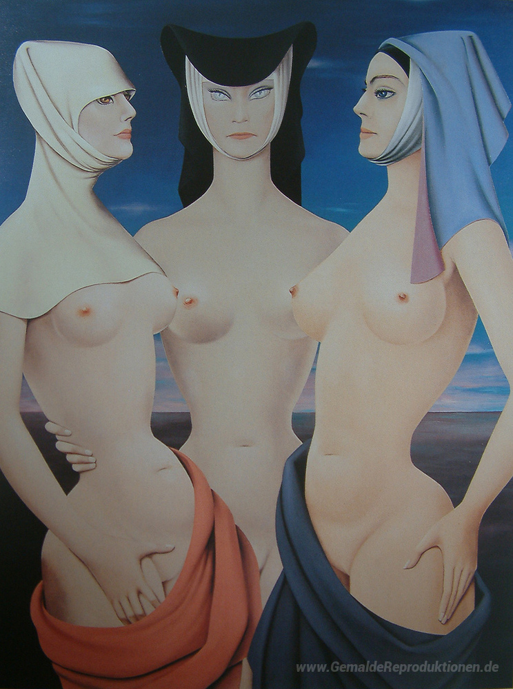 Wir bieten Ihnen eine handgefertigte Reproduktion auf Leinwand des berühmten Kunstwerks 'Cotyo, Perfica, Volupie' von Felix Labisse, aus dem Reproduktionsmuseum.