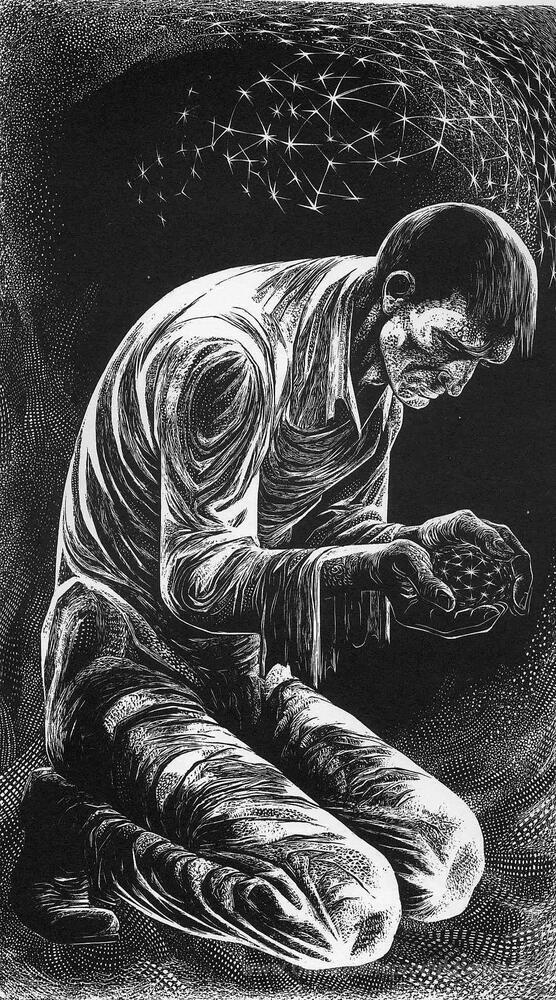 Wir bieten Ihnen eine handgefertigte Reproduktion auf Leinwand des berühmten Kunstwerks 'Cup of Sky' von Lynd Ward, aus dem Reproduktionsmuseum.