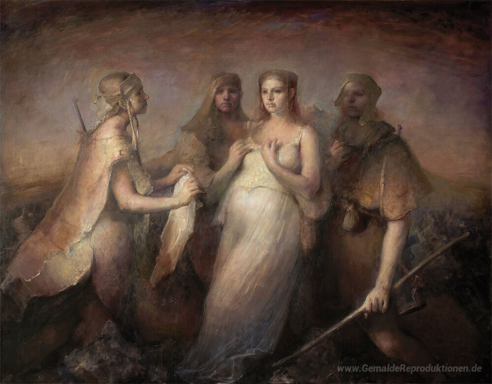 Wir bieten Ihnen eine handgefertigte Reproduktion auf Leinwand des berühmten Kunstwerks 'Der Bote' von Odd Nerdrum, aus dem Reproduktionsmuseum.