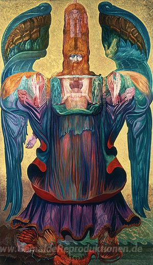 Wir bieten Ihnen eine handgefertigte Reproduktion auf Leinwand des berühmten Kunstwerks 'Der Engel der Geschichte' von Ernst Fuchs, aus dem Reproduktionsmuseum.
