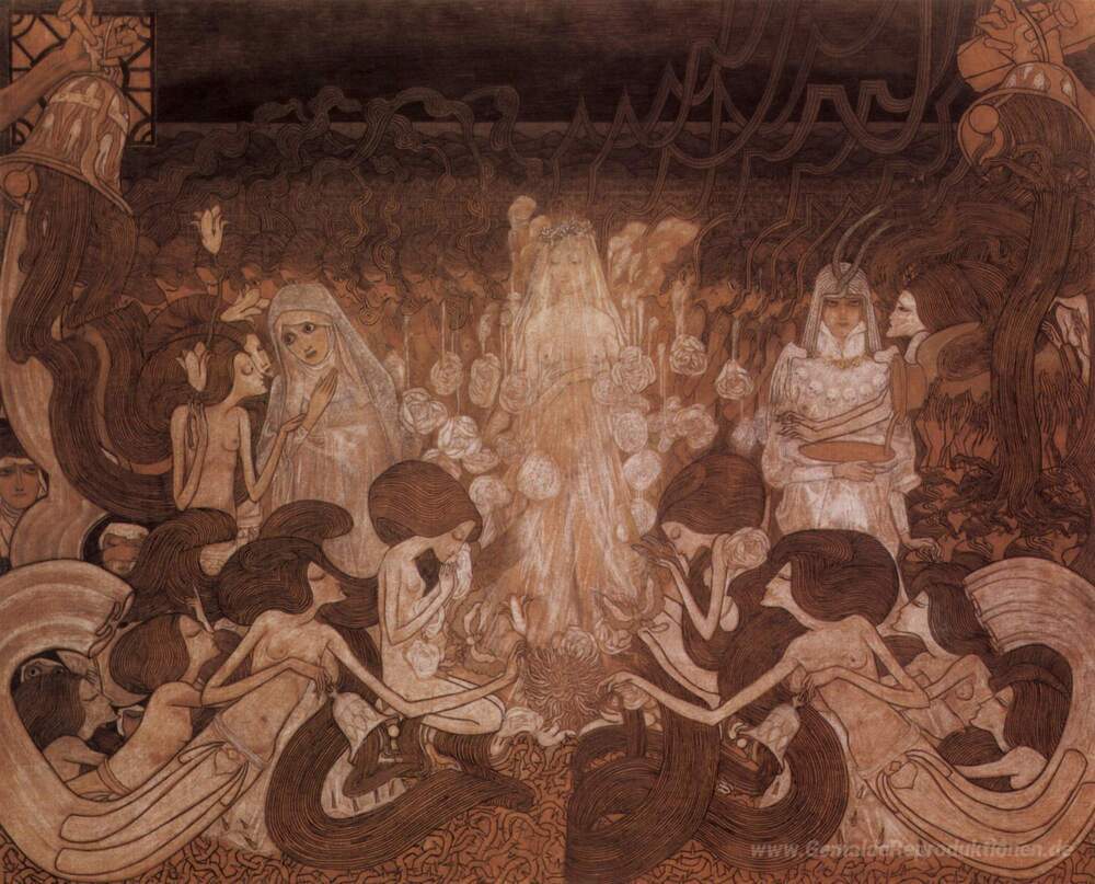 Wir bieten Ihnen eine handgefertigte Reproduktion auf Leinwand des berühmten Kunstwerks 'Die drei Verlobte' von Jan Toorop, aus dem Reproduktionsmuseum.