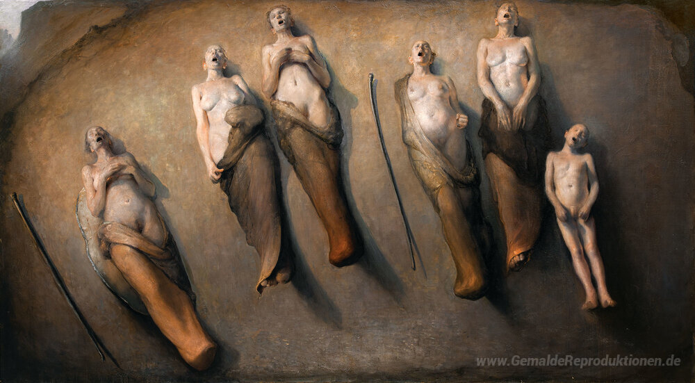 Wir bieten Ihnen eine handgefertigte Reproduktion auf Leinwand des berühmten Kunstwerks 'Fünf Sängerinnen' von Odd Nerdrum, aus dem Reproduktionsmuseum.