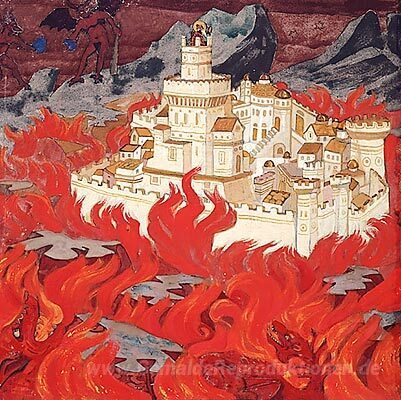 Wir bieten Ihnen eine handgefertigte Reproduktion auf Leinwand des berühmten Kunstwerks 'Fairster City - der Ärger für Feinde' von Nicholas Roerich, aus dem Reproduktionsmuseum.