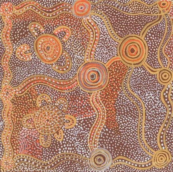 Wir bieten Ihnen eine handgefertigte Reproduktion auf Leinwand des berühmten Kunstwerks 'Frauen Geschichte' von Johnny Warangkula Tjupurrula, aus dem Reproduktionsmuseum.