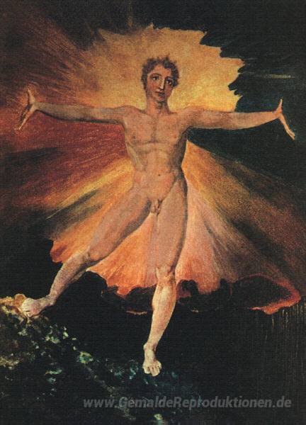 Wir bieten Ihnen eine handgefertigte Reproduktion auf Leinwand des berühmten Kunstwerks 'Glad Day oder The Dance of Albion' von William Blake, aus dem Reproduktionsmuseum.