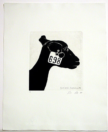 Wir bieten Ihnen eine handgefertigte Reproduktion auf Leinwand des berühmten Kunstwerks 'Goatetch' von Sue Coe, aus dem Reproduktionsmuseum.