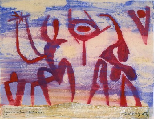 Wir bieten Ihnen eine handgefertigte Reproduktion auf Leinwand des berühmten Kunstwerks 'Gymnastique matinale' von Pierre Alechinsky, aus dem Reproduktionsmuseum.