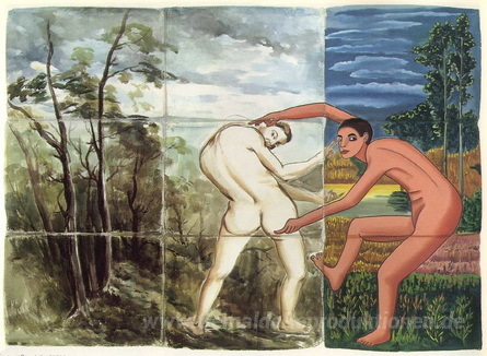 Wir bieten Ihnen eine handgefertigte Reproduktion auf Leinwand des berühmten Kunstwerks 'Innen Außen' von Francesco Clemente, aus dem Reproduktionsmuseum.