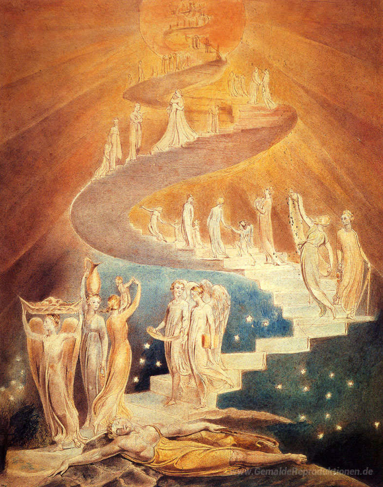 Wir bieten Ihnen eine handgefertigte Reproduktion auf Leinwand des berühmten Kunstwerks 'Jacobs Leiter' von William Blake, aus dem Reproduktionsmuseum.