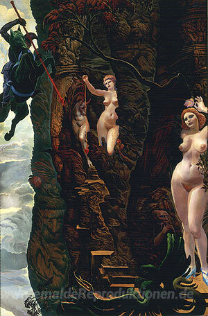 Wir bieten Ihnen eine handgefertigte Reproduktion auf Leinwand des berühmten Kunstwerks 'JAGD dem goldenen Herz' von Ernst Fuchs, aus dem Reproduktionsmuseum.