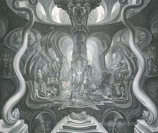 Wir bieten Ihnen eine handgefertigte Reproduktion auf Leinwand des berühmten Kunstwerks 'JOB UND Das Urteil des Paris' von Ernst Fuchs, aus dem Reproduktionsmuseum.
