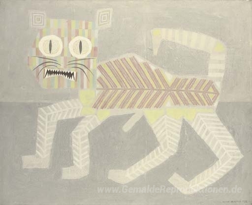 Wir bieten Ihnen eine handgefertigte Reproduktion auf Leinwand des berühmten Kunstwerks 'L'arrière Chat - grand Chat' von Victor Brauner, aus dem Reproduktionsmuseum.