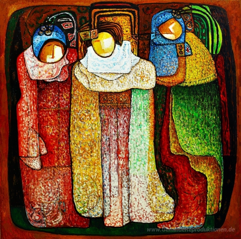 Wir bieten Ihnen eine handgefertigte Reproduktion auf Leinwand des berühmten Kunstwerks 'Magi's Rat' von George Stefanescu-Ramnic , aus dem Reproduktionsmuseum.