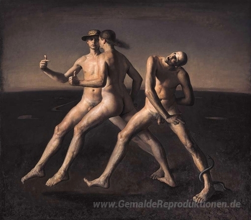 Wir bieten Ihnen eine handgefertigte Reproduktion auf Leinwand des berühmten Kunstwerks 'Mann von einer Schlange gebissen' von Odd Nerdrum, aus dem Reproduktionsmuseum.