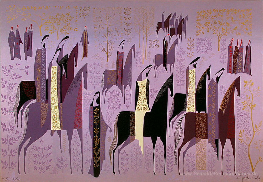 Wir bieten Ihnen eine handgefertigte Reproduktion auf Leinwand des berühmten Kunstwerks 'Medieval Promenade' von Eyvind Earle, aus dem Reproduktionsmuseum.