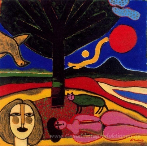 Wir bieten Ihnen eine handgefertigte Reproduktion auf Leinwand des berühmten Kunstwerks 'Paradise, Paradise' von Corneille, aus dem Reproduktionsmuseum.