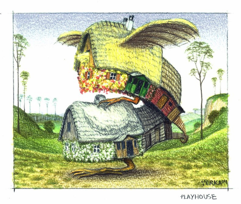Wir bieten Ihnen eine handgefertigte Reproduktion auf Leinwand des berühmten Kunstwerks 'Playhouse' von Jacek Yerka, aus dem Reproduktionsmuseum.