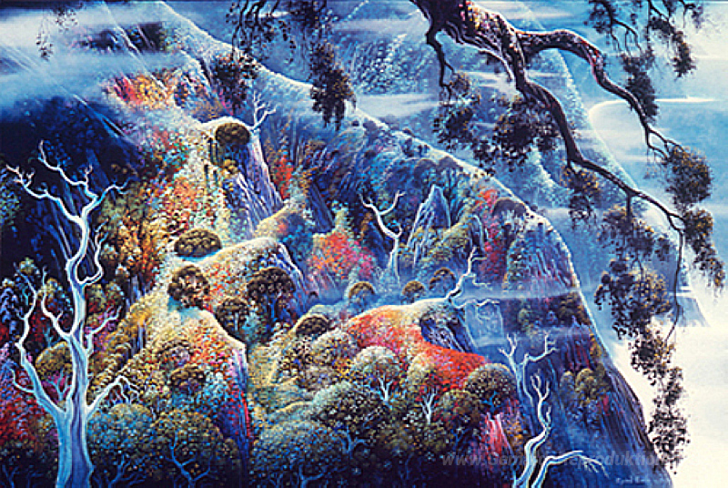 Wir bieten Ihnen eine handgefertigte Reproduktion auf Leinwand des berühmten Kunstwerks 'Symphonische Fantasie' von Eyvind Earle, aus dem Reproduktionsmuseum.
