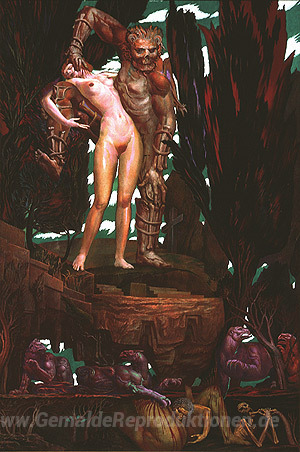Wir bieten Ihnen eine handgefertigte Reproduktion auf Leinwand des berühmten Kunstwerks 'Tanzen mit DEATH' von Ernst Fuchs, aus dem Reproduktionsmuseum.