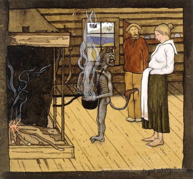 Wir bieten Ihnen eine handgefertigte Reproduktion auf Leinwand des berühmten Kunstwerks 'Teufel durch den Pot' von Hugo Simberg, aus dem Reproduktionsmuseum.