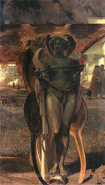 Wir bieten Ihnen eine handgefertigte Reproduktion auf Leinwand des berühmten Kunstwerks 'Thanatos II' von Jacek Malczewski, aus dem Reproduktionsmuseum.