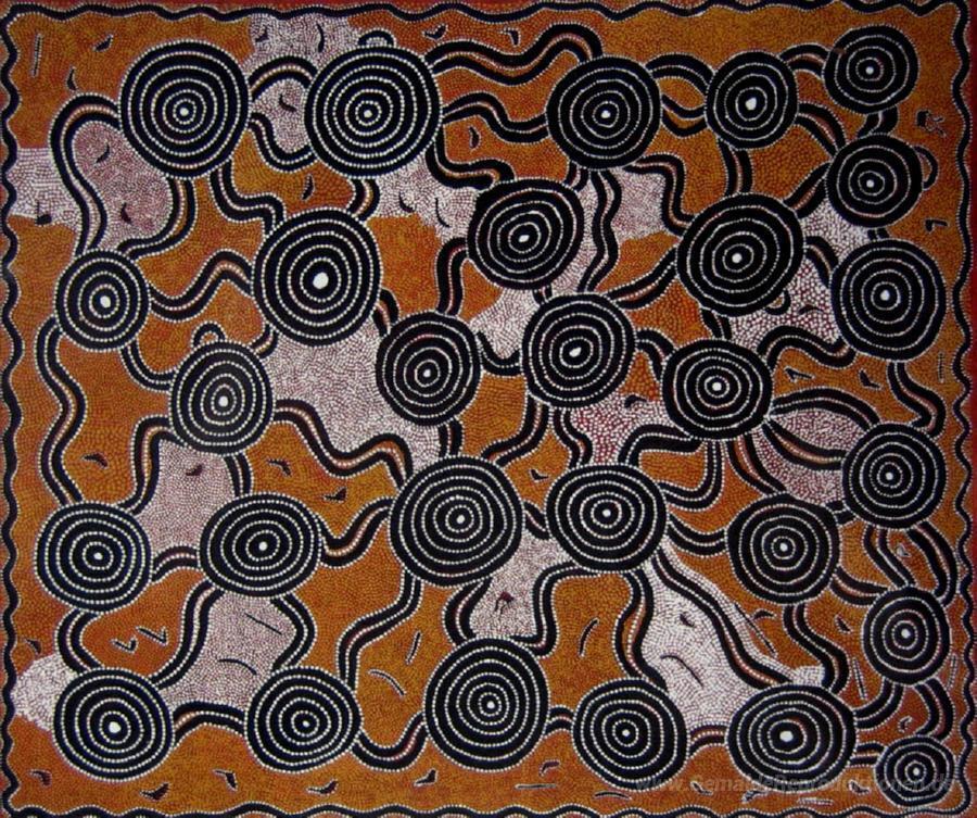 Die expressive Farbpalette und die sorgfältig gewählten Techniken von Warangkula Tjupurrula verleihen dem Tingari bei Tjikarri eine bemerkenswerte Tiefenschärfe und Lebendigkeit. Die harmonische Kombination aus Konturen und Texturen ermöglicht es Ihnen, das Gemälde nicht nur zu betrachten, sondern auch zu fühlen. In Ihrem Zuhause wird dieses Kunstwerk zu einem wahren Blickfang, der sowohl inspirierende Energie als auch harmonische Ruhe ausstrahlt und somit Ihre persönliche Atmosphäre bereichert.