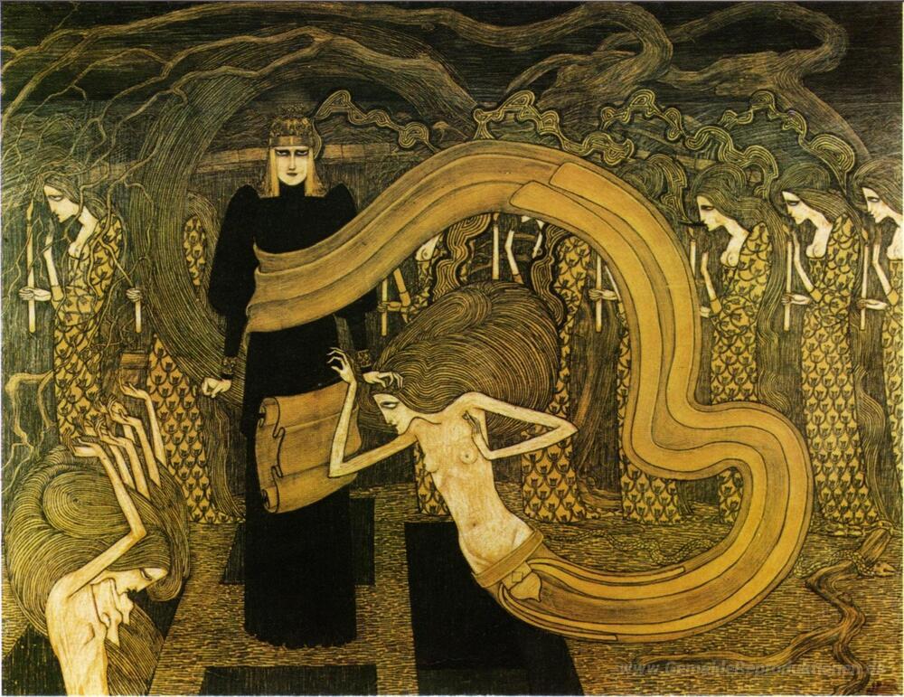 Wir bieten Ihnen eine handgefertigte Reproduktion auf Leinwand des berühmten Kunstwerks 'Todesfall' von Jan Toorop, aus dem Reproduktionsmuseum.