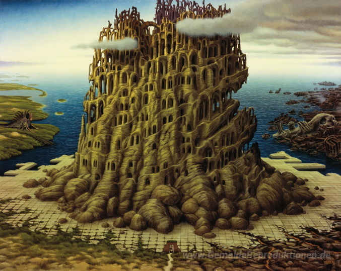 Wir bieten Ihnen eine handgefertigte Reproduktion auf Leinwand des berühmten Kunstwerks 'Triptychon - der mittlere Teil' von Jacek Yerka, aus dem Reproduktionsmuseum.