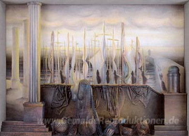 Wir bieten Ihnen eine handgefertigte Reproduktion auf Leinwand des berühmten Kunstwerks 'Une vieille histoire, dans un vieux port, sur un vieux Kontinent' von Mimi Parent, aus dem Reproduktionsmuseum.