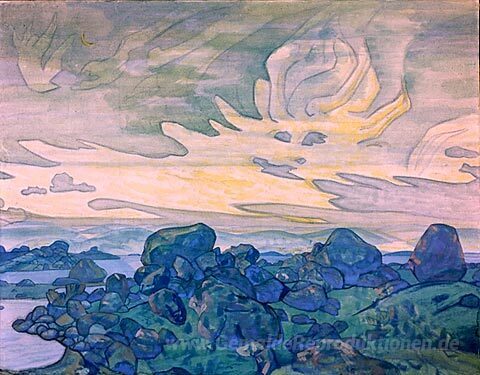 Wir bieten Ihnen eine handgefertigte Reproduktion auf Leinwand des berühmten Kunstwerks 'Weg des Riesen' von Nicholas Roerich, aus dem Reproduktionsmuseum.