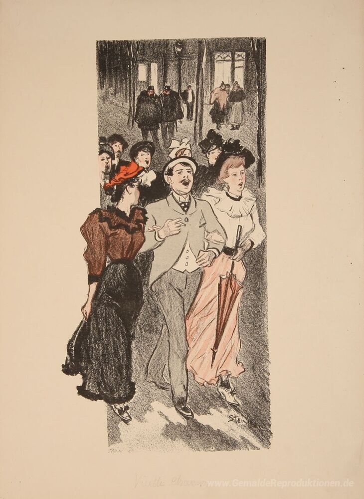 Wir bieten Ihnen eine handgefertigte Reproduktion auf Leinwand des berühmten Kunstwerks 'Aupres de Ma Blonde' von Theophile Steinlen, aus dem Reproduktionsmuseum.