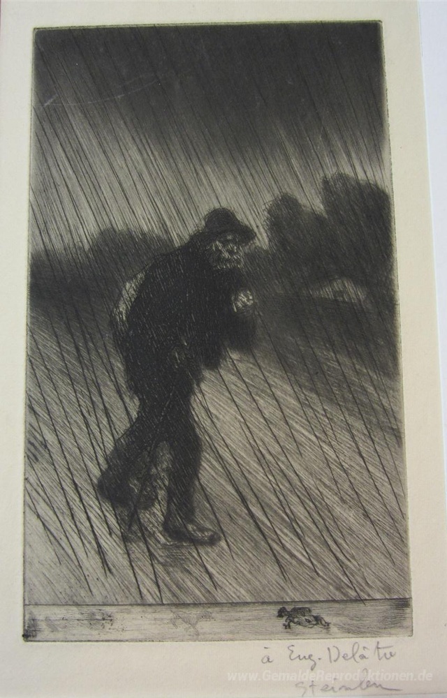 Wir bieten Ihnen eine handgefertigte Reproduktion auf Leinwand des berühmten Kunstwerks 'Chemineau Sous la pluie' von Theophile Steinlen, aus dem Reproduktionsmuseum.
