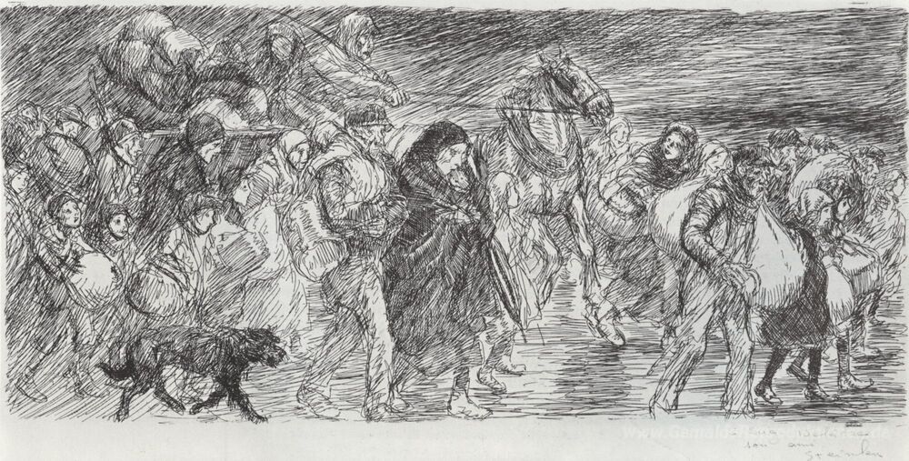 Wir bieten Ihnen eine handgefertigte Reproduktion auf Leinwand des berühmten Kunstwerks 'Exode - en Longeur' von Theophile Steinlen, aus dem Reproduktionsmuseum.