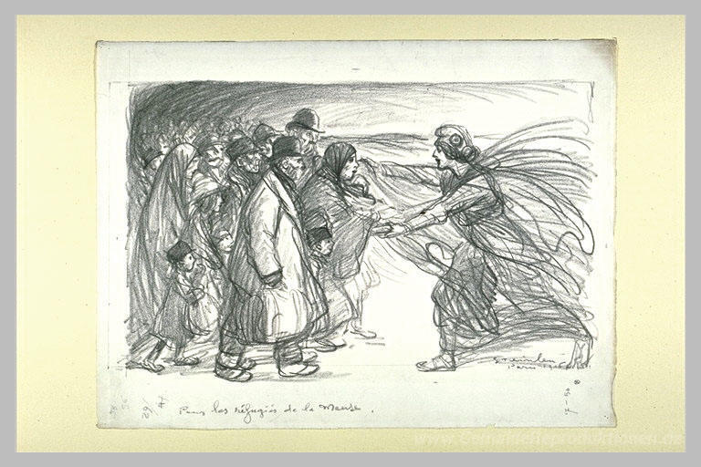Wir bieten Ihnen eine handgefertigte Reproduktion auf Leinwand des berühmten Kunstwerks 'Gießt Les Réfugiés de la Meuse' von Theophile Steinlen, aus dem Reproduktionsmuseum.
