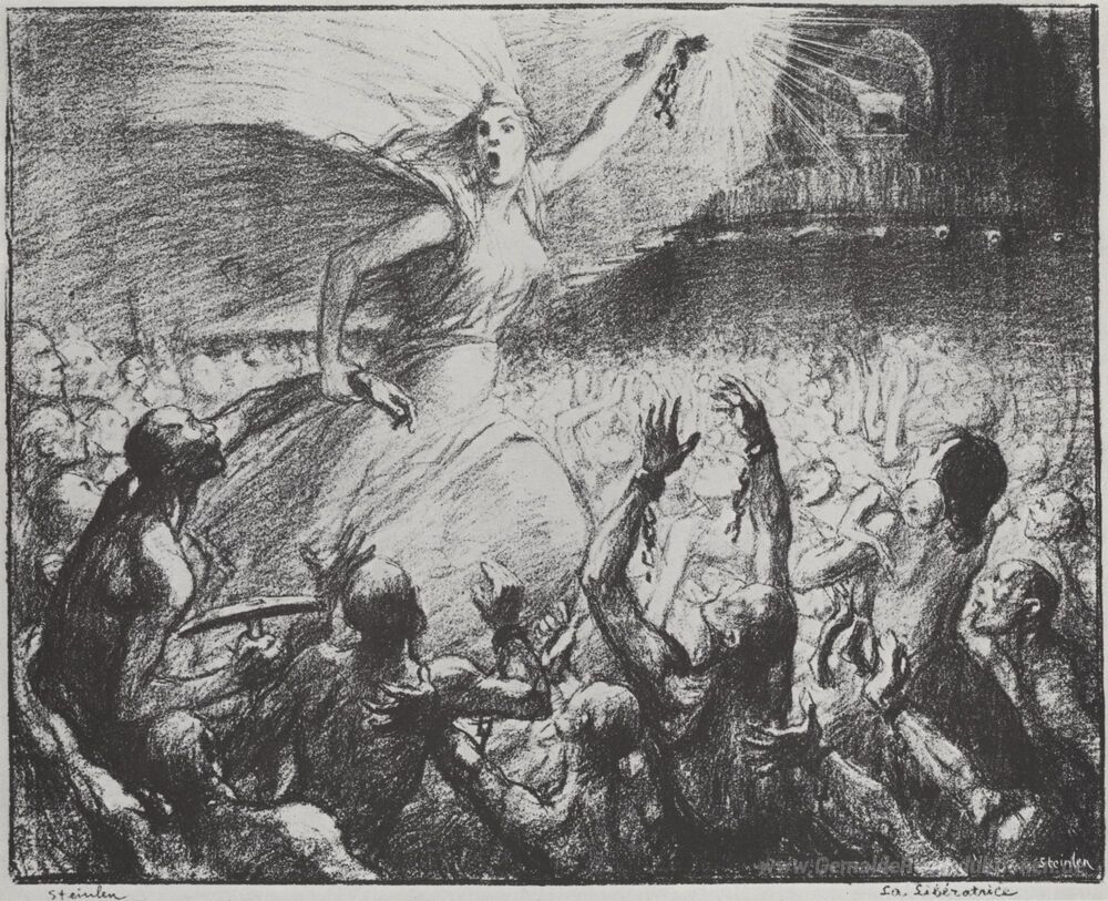 Wir bieten Ihnen eine handgefertigte Reproduktion auf Leinwand des berühmten Kunstwerks 'La Liberatrice' von Theophile Steinlen, aus dem Reproduktionsmuseum.